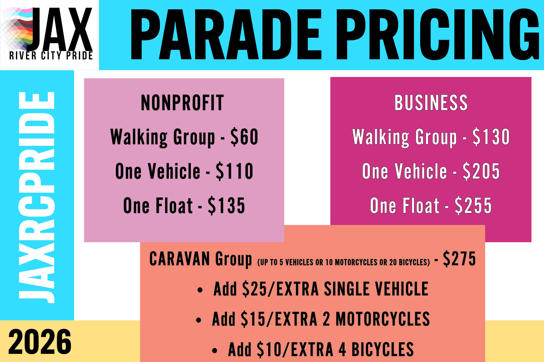 Have questions? We’re happy to help! Email parade@jaxrcpride.org for more information. Let’s make 2026 the best Pride Parade yet!